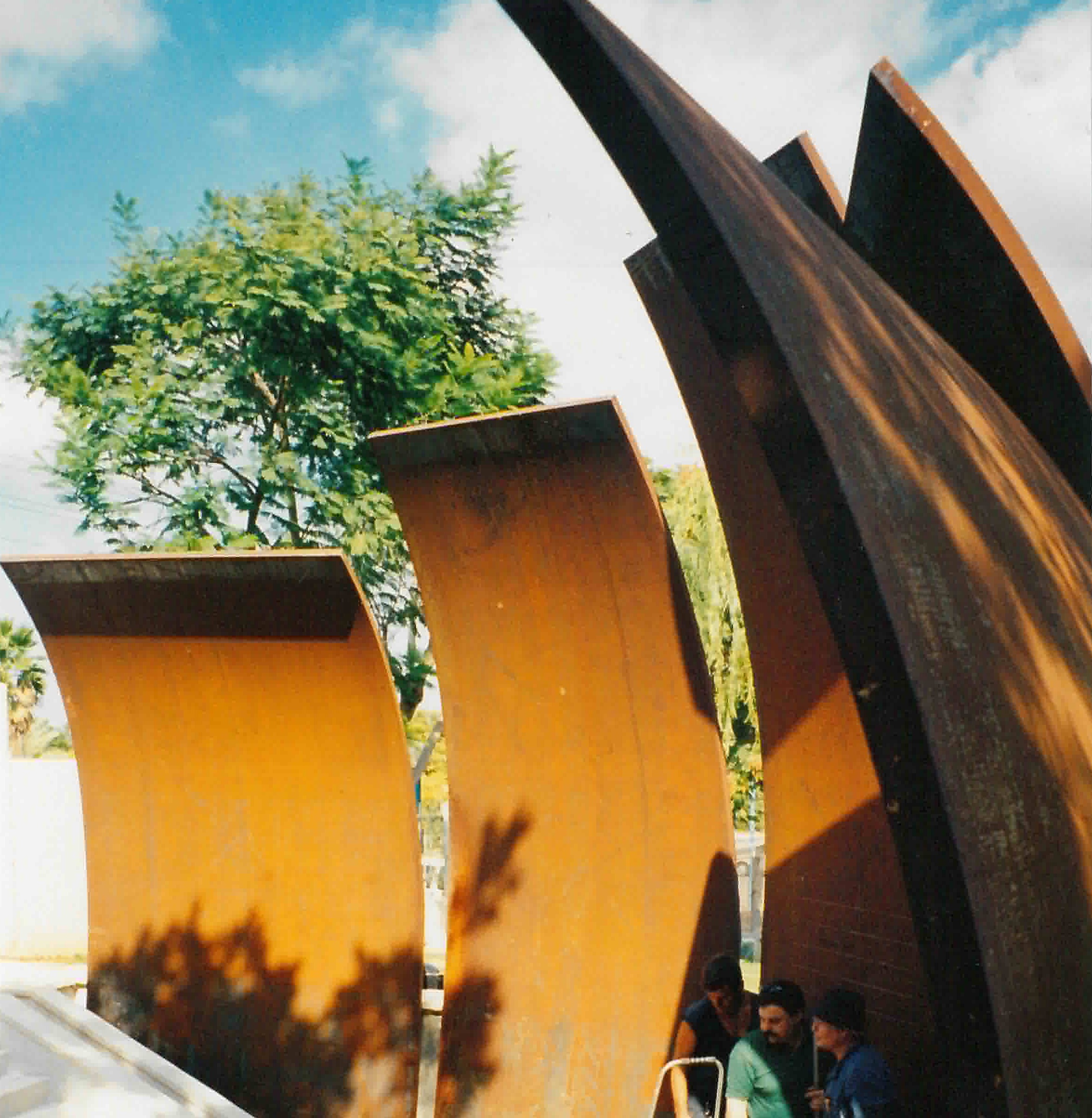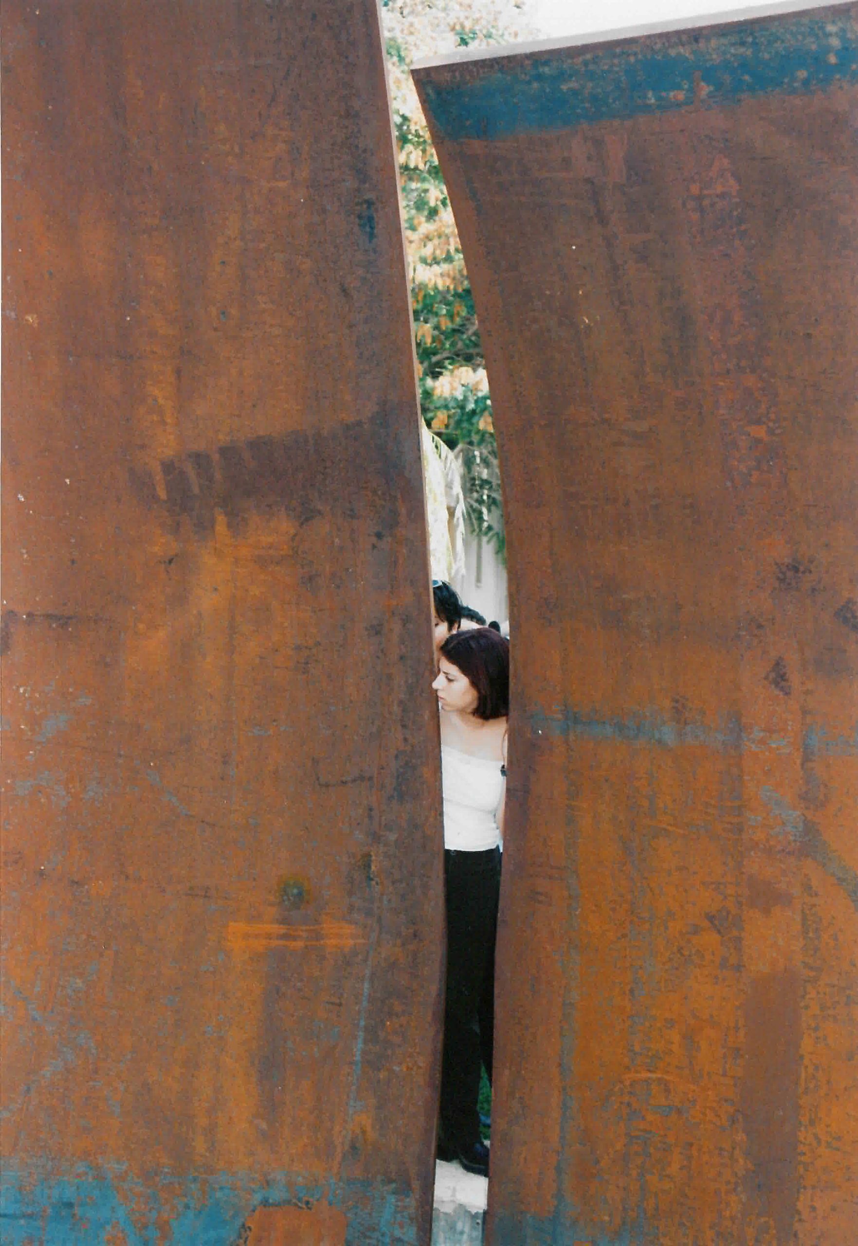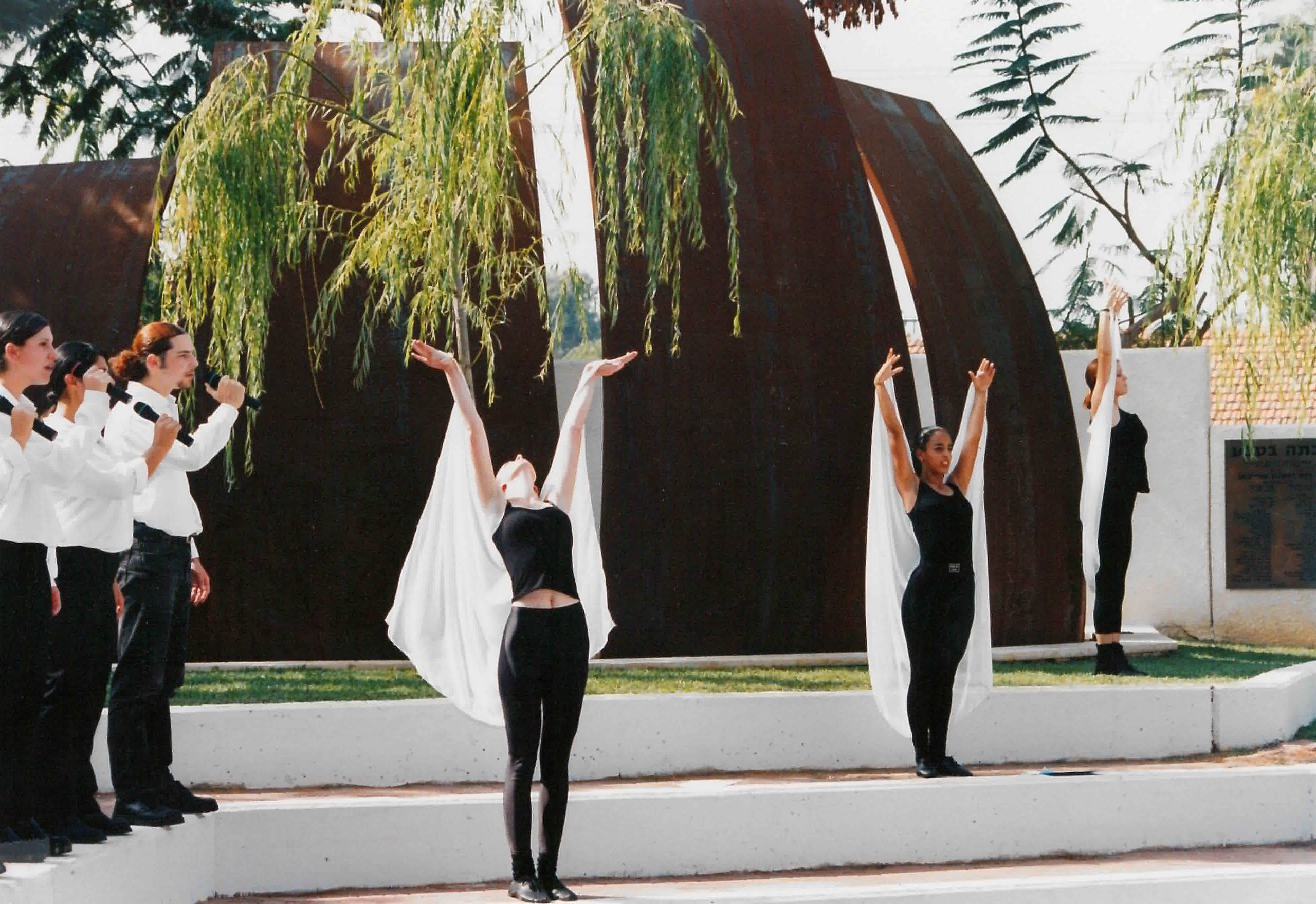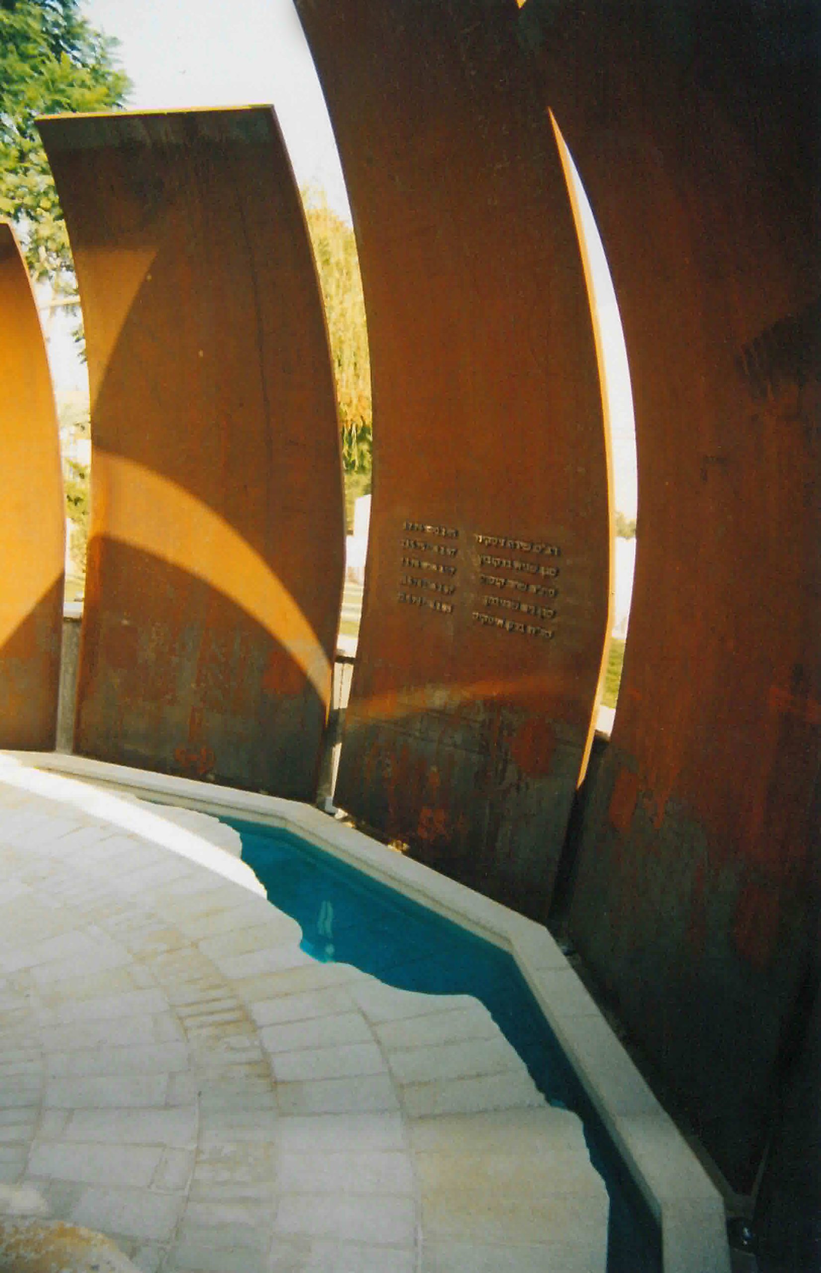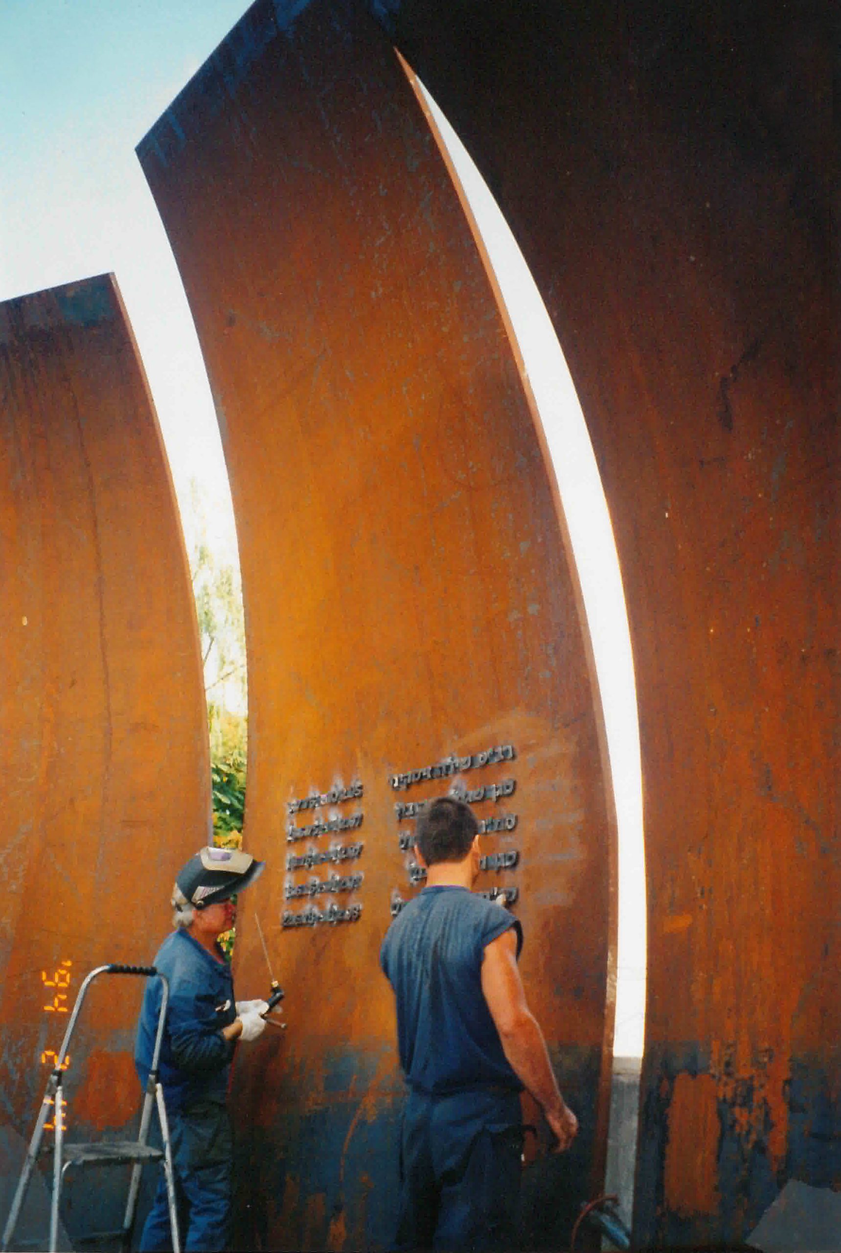 החומרים: עלי פלדה חלודה בעובי 50 מ"מ יוצרים לוחות זיכרון המגדירים את